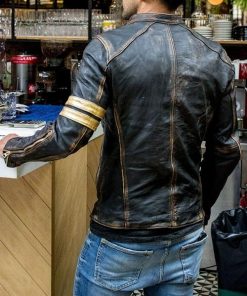 The Men’s Leather Biker Jacket has two yellow stripes on Sleeves. The choice of stylish men and is perfect for a night out with friends. The fine quality stitching makes the jacket durable to wear